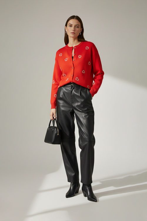 Bisiklet Yaka Kalp Düğme ve Kalpler Nakışlı Triko Hırka